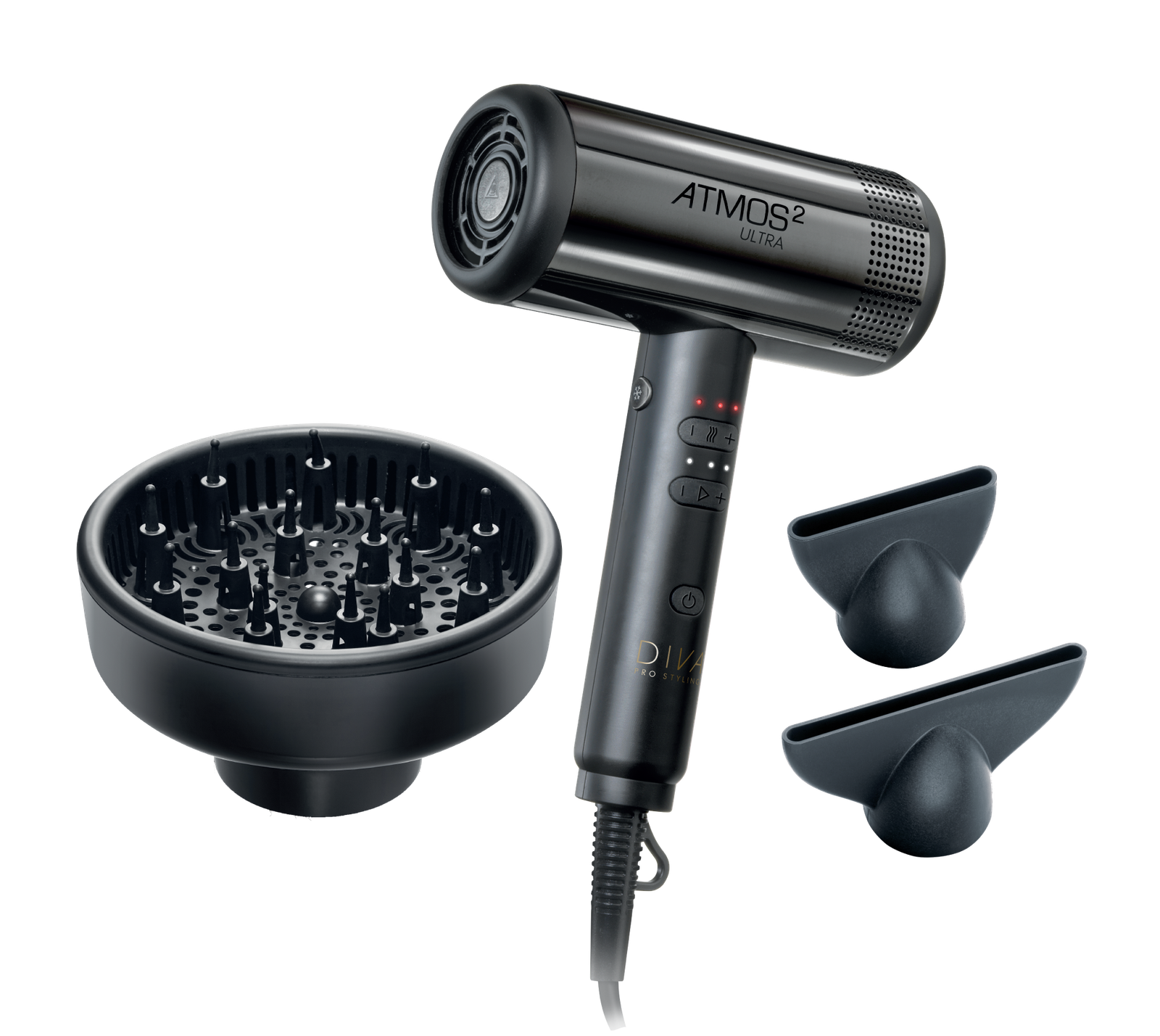 Revoliucija jūsų salone – naujasis Diva Pro Styling Atmos 2 Ultra plaukų džiovintuvas užtikrina greitesnį džiovinimą su didesniu oro srautu ir padidintu oro slėgiu greitesniam formavimui. Tylus veikimas ir ypač lengvas dizainas užtikrina patogų naudojimą.