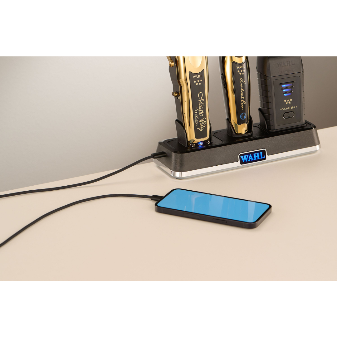 Wahl Power Station – patikima ir universali įkrovimo stotelė profesionalams. Vienu metu įkraukite iki trijų belaidžių Wahl kirpimo mašinėlių, trimerių ar skustuvų. Su 6 keičiamosiomis jungtimis ir USB-C lizdu mobiliesiems įrenginiams, ši stotelė užtikrina greitą įkrovimą, tvarkingą darbo vietą ir maksimalų efektyvumą. Kompaktiškas dizainas leidžia stotelę pastatyti prie sienos, taupant vietą. Ideali kirpėjams, barzdaskučiams ir grožio specialistams, ieškantiems patikimo sprendimo savo darbo įrankiams. Komplekte 6 keičiamos jungtys, pritaikomos pagal įrankius, taip pat 5V įkroviklis.